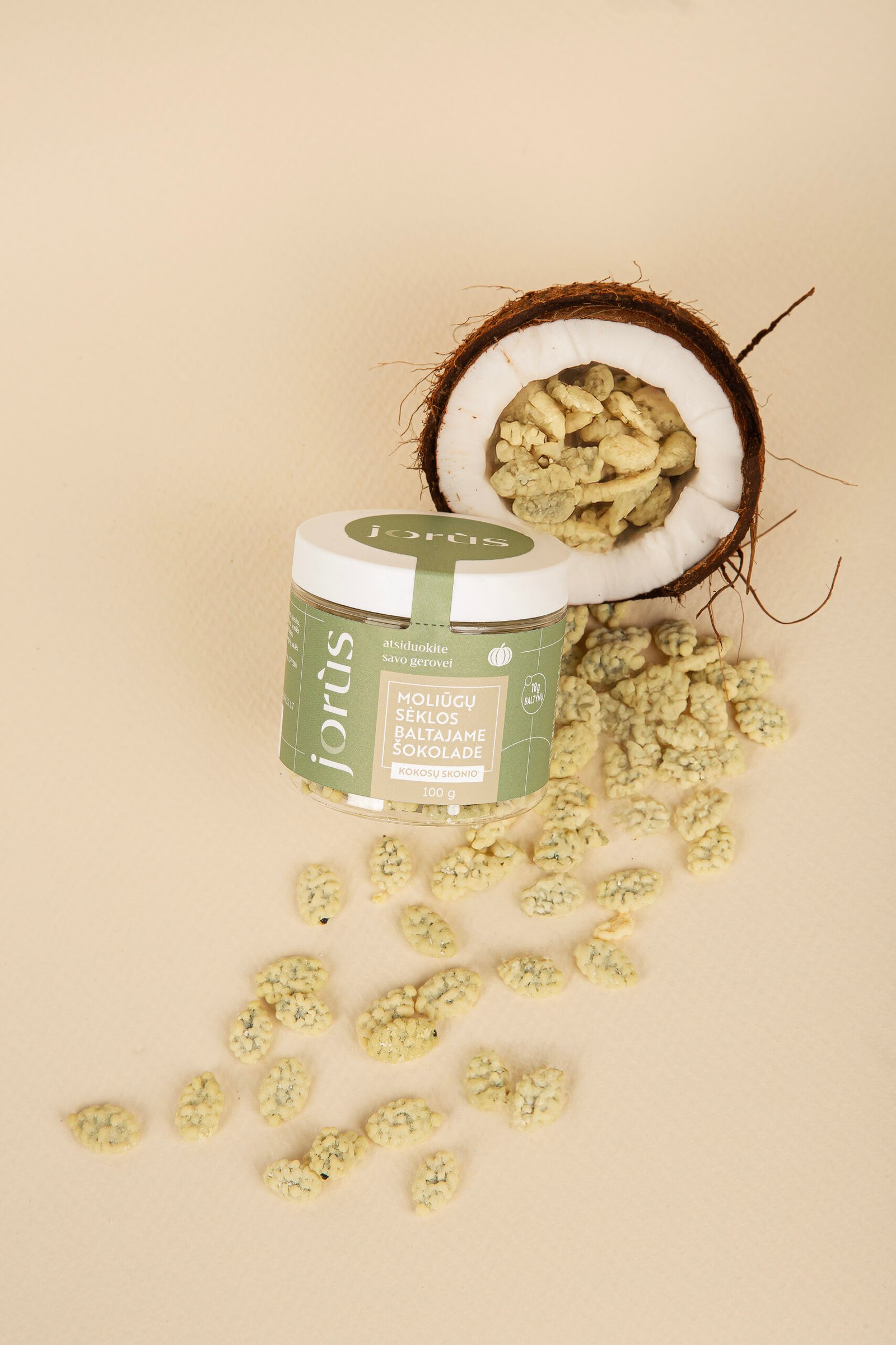 Gardus ir traškus užkandis – kokosų skonio moliūgų sėklos baltajame šokolade.